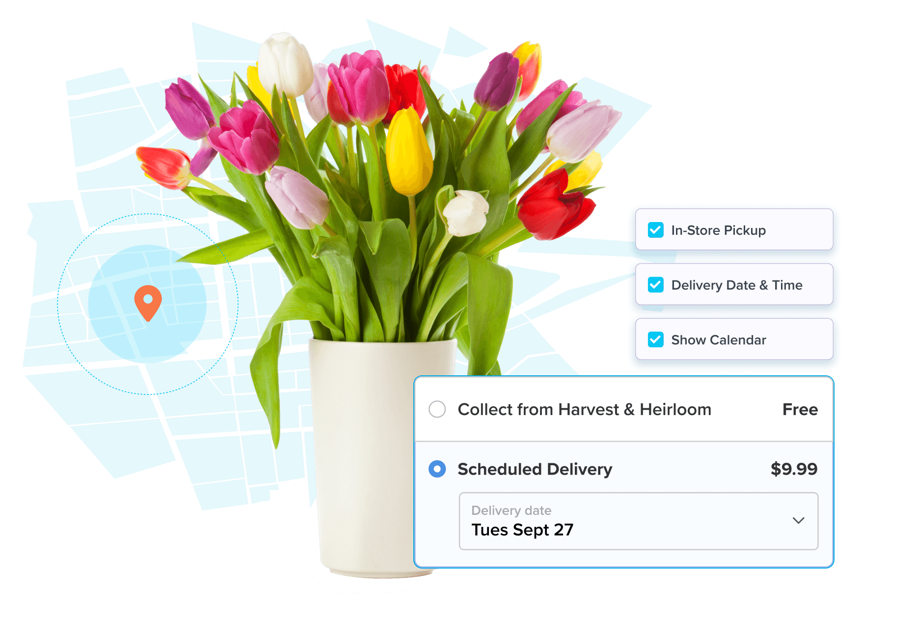 Offer a calendar date/time picker and in-store pickup options for a checkout experience that converts.